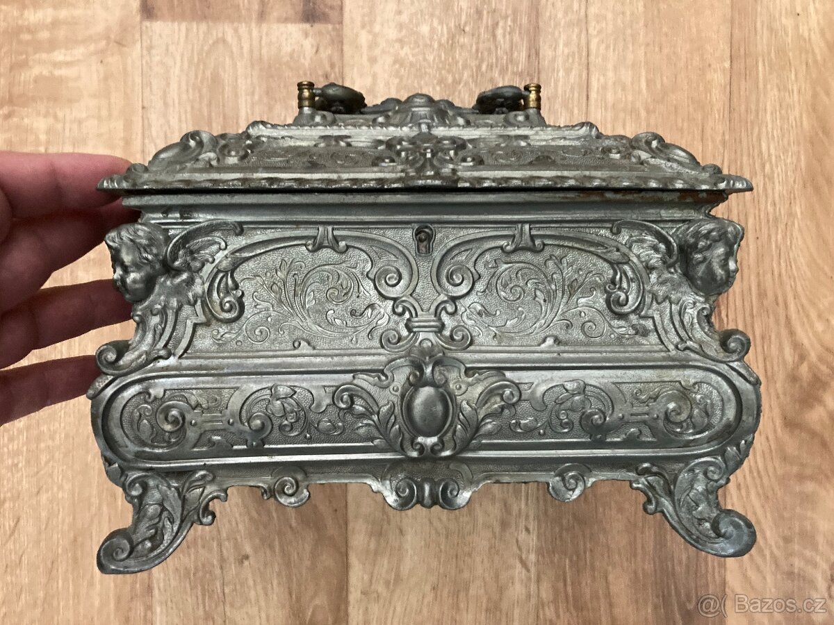 Prodám starožitnou masivní cínovou šperkovnici, truhlička, pokladnice, klenotnice. Nádherně zdobená. Váha zhruba 5 kg. Zájemci pište prosím mejlem.