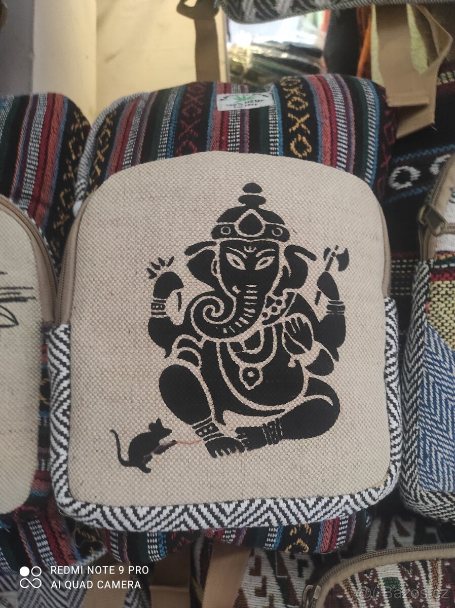 Ručně šité batohy z Váránasí. K dispozici spousta dalšího zboží.