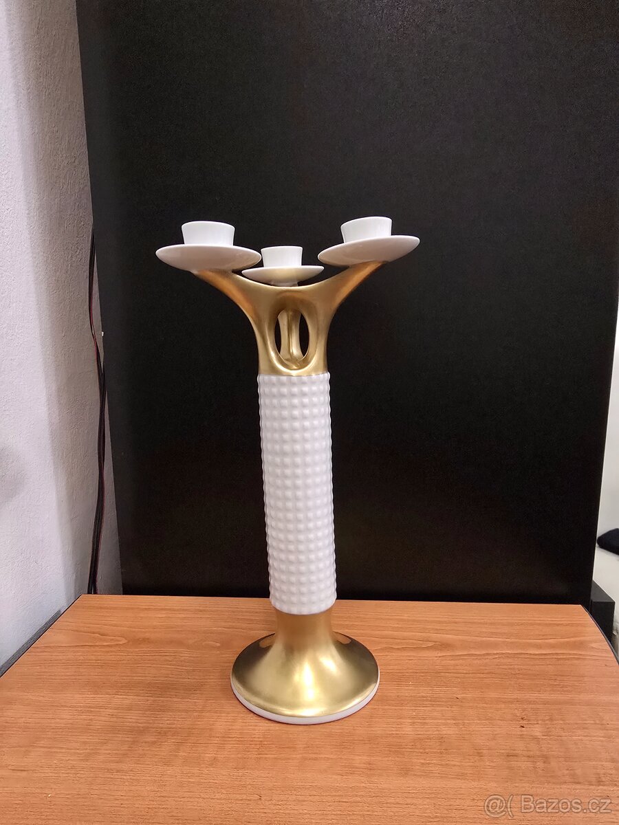 Materiál a provedení: Je vyroben z bíle glazovaného porcelánu a částečně zlacený. Dřík svícnu má výrazný reliéfní geometrický dekor.