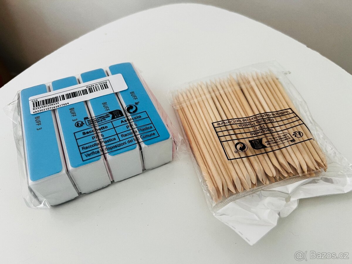 laky jsou otevřené, černý je kupovaný z druhé ruky – je takový tahavy ale ještě s tím jde udělat nehet. Zbytek je originál z e-shopu miuna.cz, k tomu ÚV lampa, dřívka na sloupávání a pilníky o 4 stupních jemnosti, Štětce na zdobení nehtů