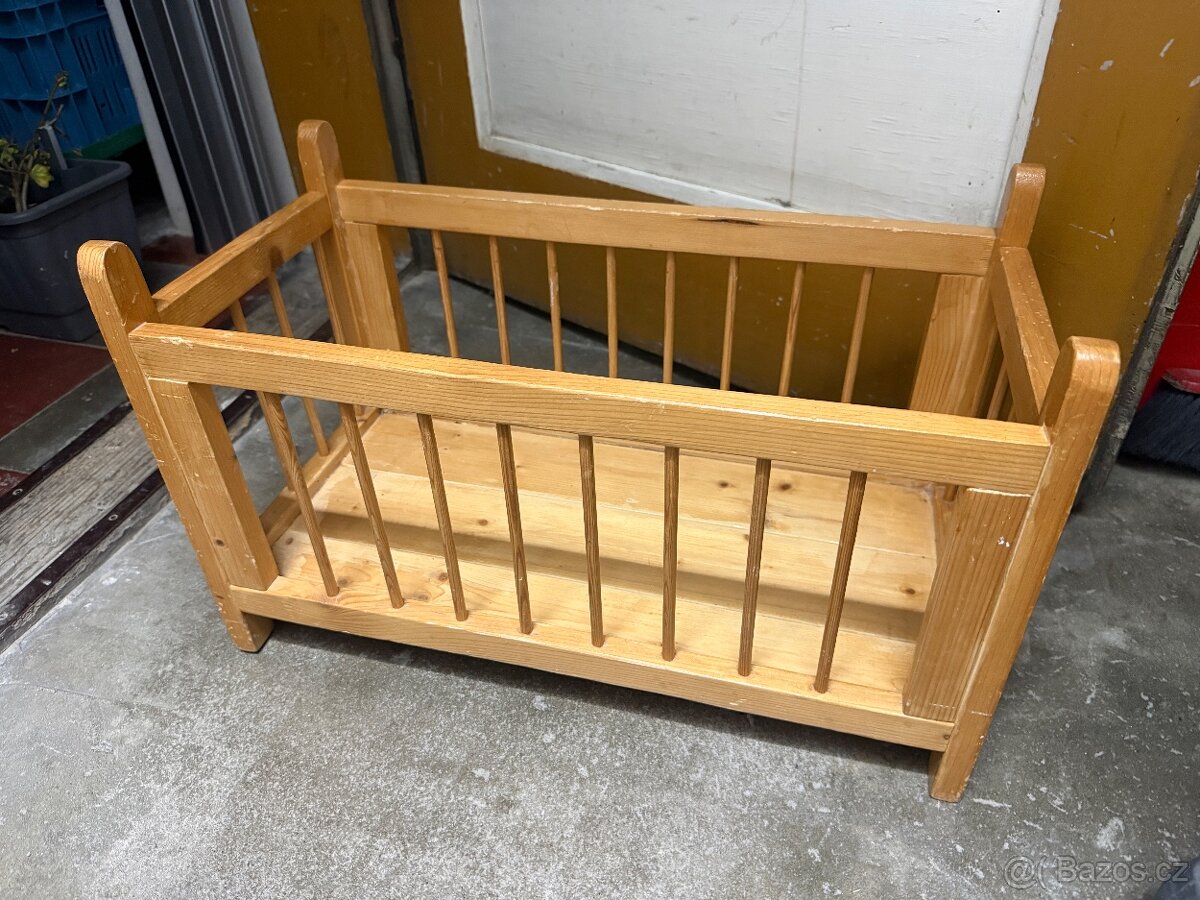 prodám dřevěnou postýlku pro panenky, rozměry 55x27cm, výška 34cm, vnitřní rozměry 51x23, výška 22cm, tak jak je na fotkách, cena 199,- kč.