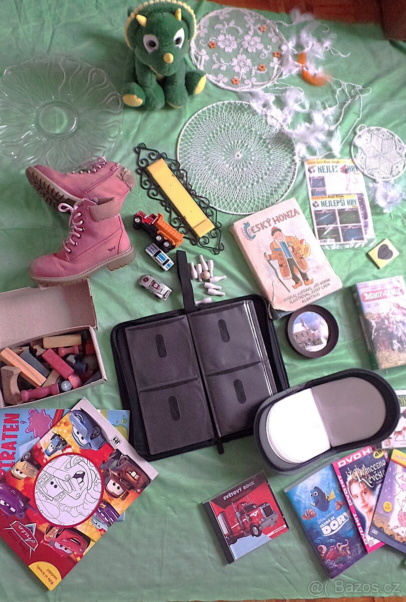 Kus 40 Kč: plyšový dinosaurus, zimní boty vel. 31, lapače snů, kniha Český Honza, zásobníky na CD/DVD, DVD, video kazeta, autíčka, talíř, stavebnice ......