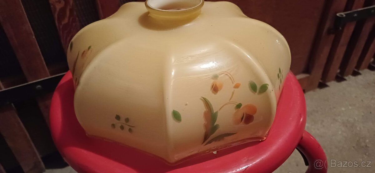 Prodám starožitné stínítko k lampě, průměr asi 23cm v mléčné béžové barvě s malovaným dekorem.