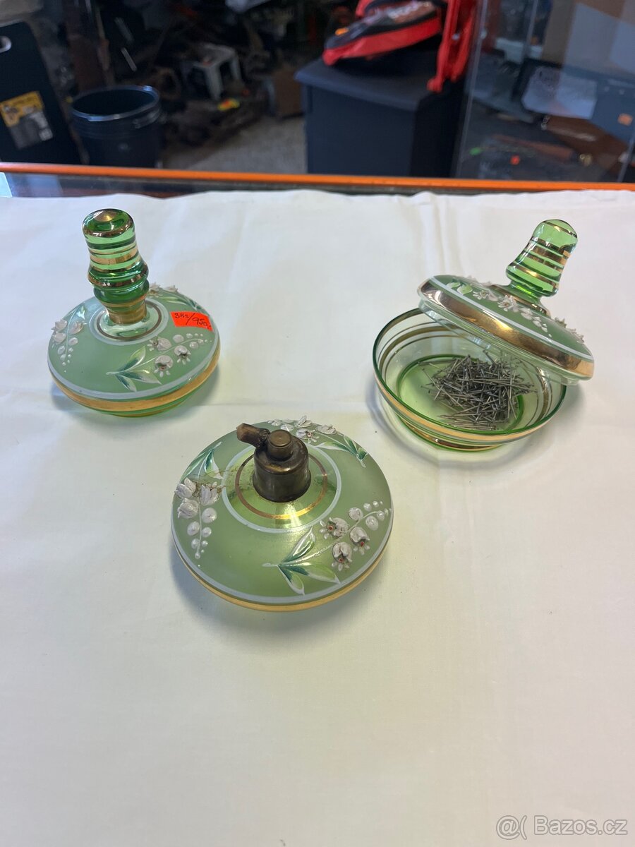 Prodám starožitnou toaletní sadu s konvalinkami, ručně malované vystouplé květy. Průměry 9-10cm, výšky 7-9cm. Podívejte se i na mé další nabídky.