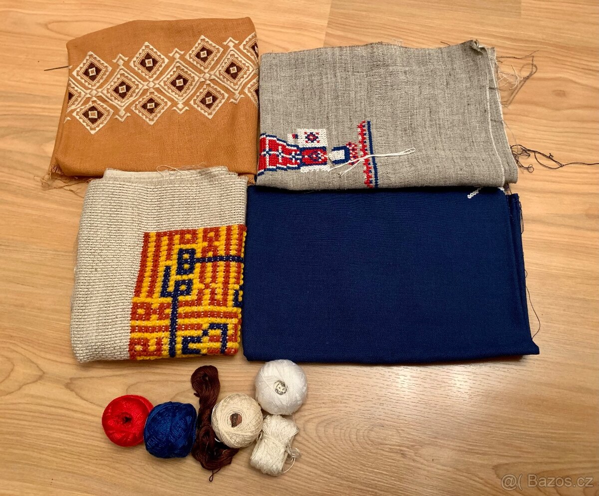 4 menší nedokončené ubrusy k dovyšití, 5 vyšívacích bavlnek a 2 jehly. Modrý ubrus 77x95, béžový 35x76 cm, hnědý 77x56 cm, šedý 68x50 cm.