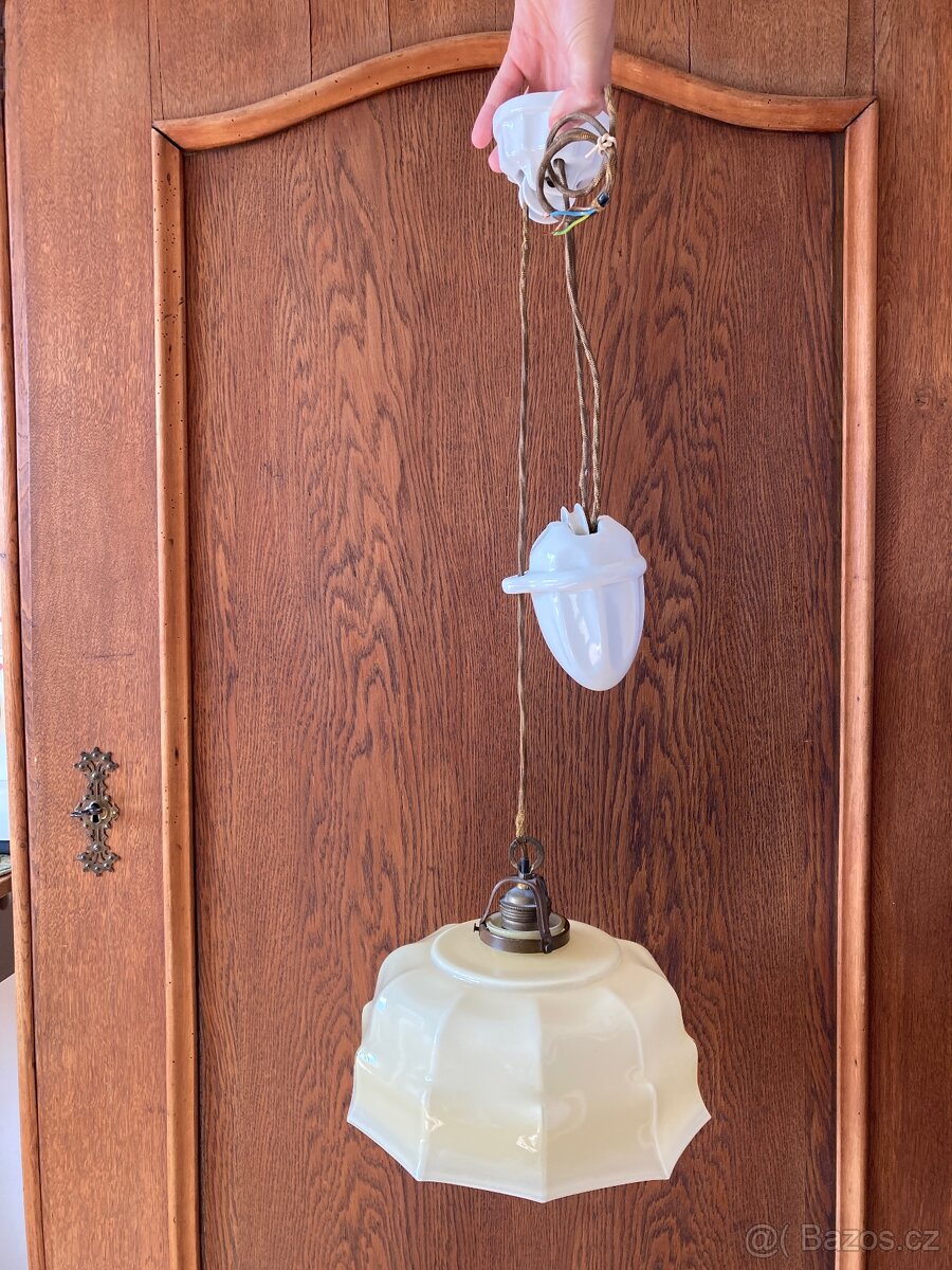 Starožitný stahovací lustr Erco, Nemecko - [10.1. 2026]Stahovačka je úplně funkční. Horní krytek a spodek na stínidlo je z bílého bakelitu, vejce je skleněné. Nový opletený kabel. Nepoškozené stinidlo z dvouvrstvého skla. Vejce má dva menší oťuky - viz foto.