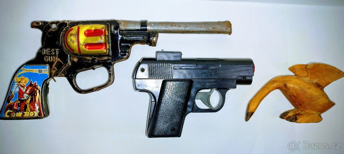 Plechová pistolka, made in Japan. Chybí vnitřní mechanismus a spoušť. Plastová pistolka. Dřevěná figurka ptáka.
