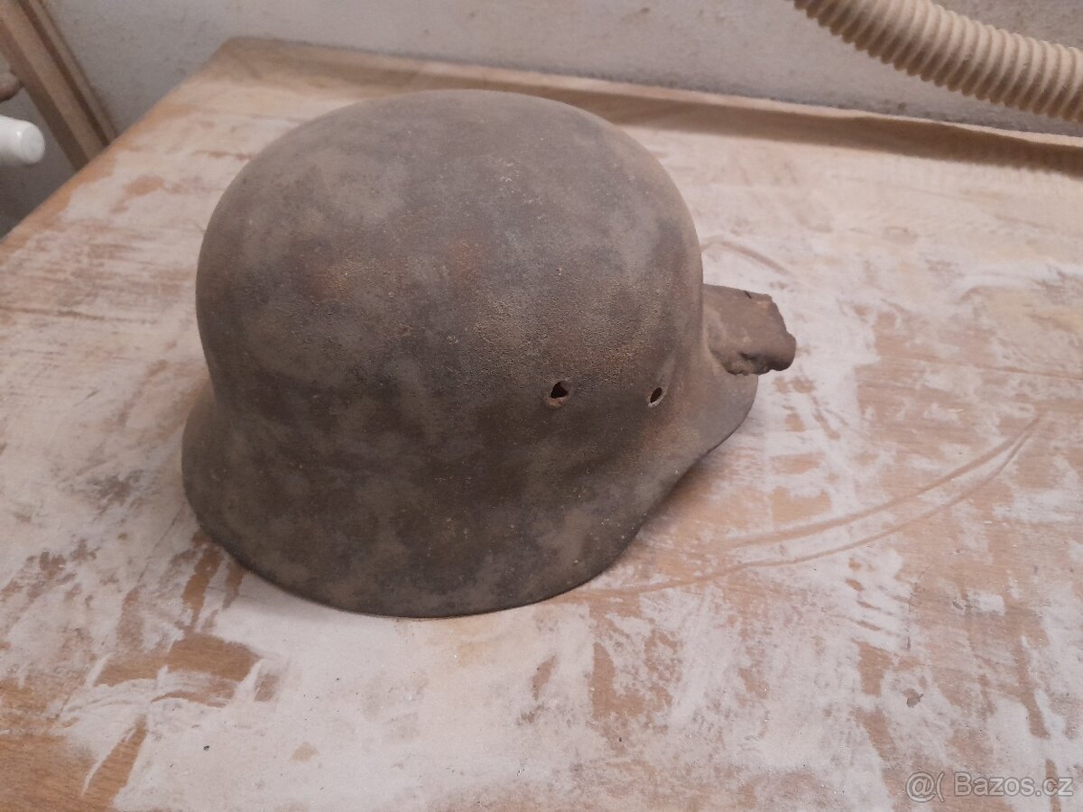 Přilbu zapomněl nějaký němec v roce 1945 v obci Olomučany. Otec k ní pak přivařil trubku pro upevnění dřevěné násady a používal na stavbě k nabírání vápna. Teď je na prodej a těší se na renovaci.