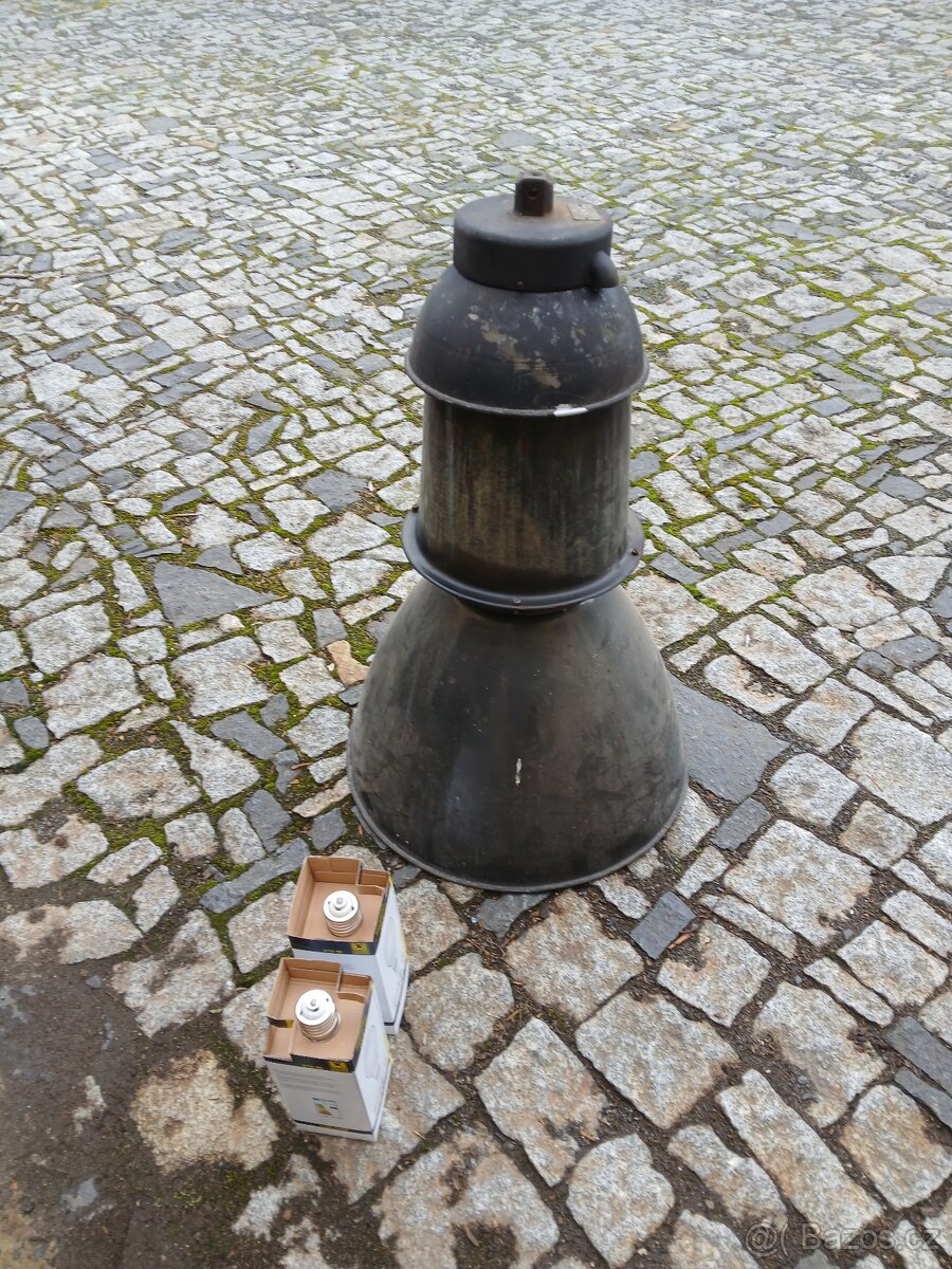 Stará nádražní lampa z cca 80tých let, používaná k osvětlení nádražního prostoru. Stav dle foto+náhradní, nové sodíkové výbojky(patice E/40) a nějaké ND. Lampa má bajonetový úchyt pro uvolnění a spuštění ocelovým lankem pro výměnu výbojky. Lampa není odzkoušena, nálezový stav z dílny. Vhodné pro osvětlení dvora, sběratele železnice atd...