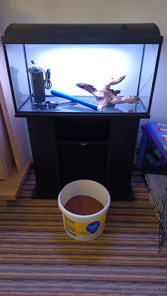 Nabízím zde akvárium o rozměrech 80x35x40 o objemu 112L včetně osvětlení, skříňky, podložky, vnitřního filtru Eheim 160, topítka, pozadí (modrá/černá), písku a kořene. Vše patrné z fotek. Cena 2500,- inzerát platí do smazání.