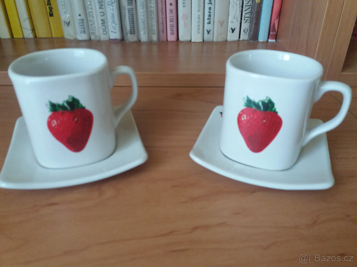 Dva kávové šálky AVON se vzorkem jahody, s moderními podšálky (na nich také drobný sybol jahody). Zcela nové. Mohou být pěkným dárkem.