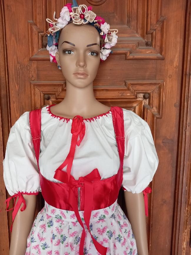 Chodský kroj Postřekovský se skládá ze sukně s živůtkem, bílé košilky s červenými stužkami a světlé zástěry s drobnými kytičkami. Kroj je ve velikosti S. Délka od ramen dolů je 100 cm. Věneček není součástí ceny. Je pouze k dekoraci.