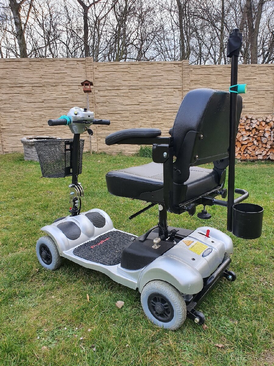 Vozík pro seniory, velmi skladný, lehce rozlozitelny, vejde se do kufru každého auta. Málo používaný, ujede okolo 20km, navíc košík na nakup, držák hole, osvětlení. Vhodný do interiéru i exteriéru, projede dveřmi 60cm! Pořizovací cena 32.000,-