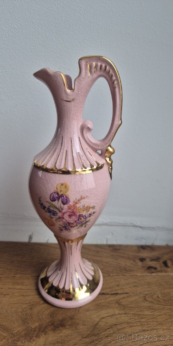 Růžová amfora s uchem. Růžový porcelán s květinovým dekorem a zlacením. Vyrobeno - Victoria, Stará Role. Výška18,5 cm, šířka dolní části 5,5 cm. Bez oťuků.