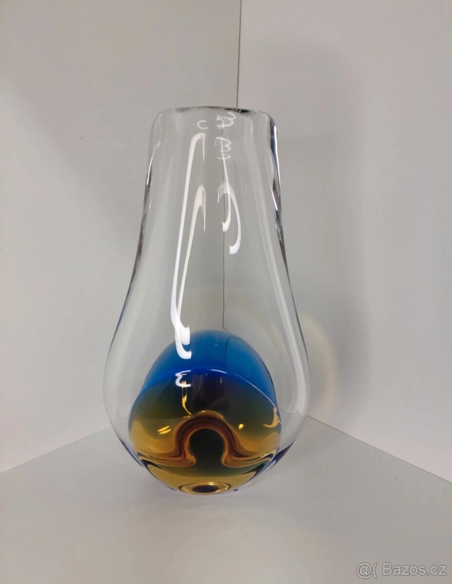 Váza 23 cm, barevné hutní sklo J. Hospodka Chřibská - [6.2. 2026]Autorská masivní váza ve tvaru květiny z barevného hutního skla. Návrh Josef Michal Hospodka, sklárna Chřibská, 60.léta 20.století. Výška max cca 23.5 cm, váha 1670g, hloubka cca 13.5 cm. Velmi dobrý stav bez prasklin a oťuků, menší známky používání ...