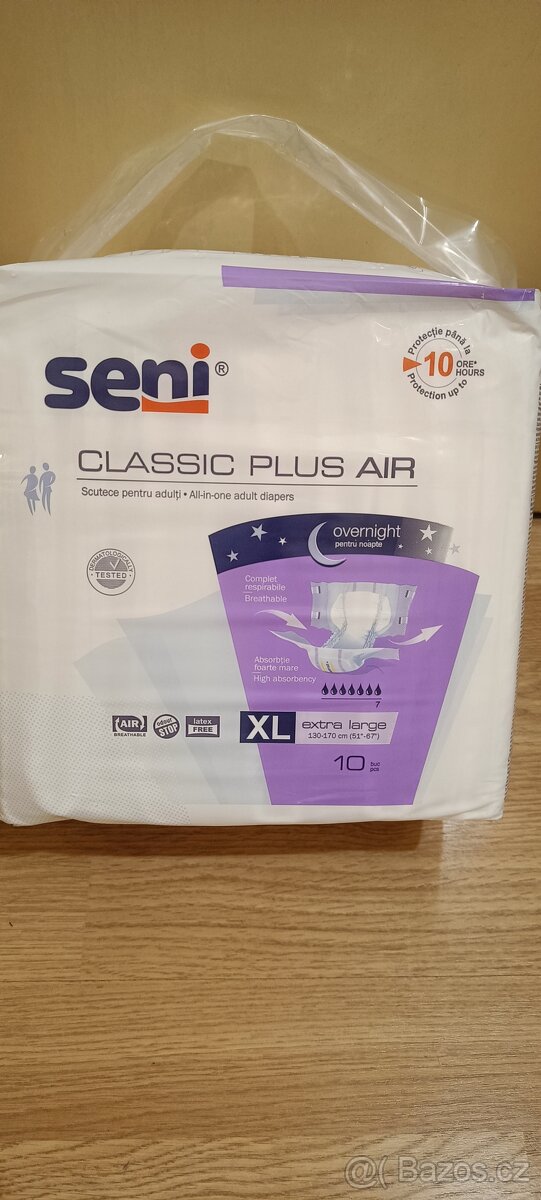 Prodám pleny pro dospělé, nové, neotevřené balení, Seni - classic plus air, velikost XL, obvod pasu 130-170cm, mám více balení. Expirace 8 /2030. Cena balení (10 kusů) 250,-Kč. Jen osobní předání, neposílám. Poděbrady a okolí