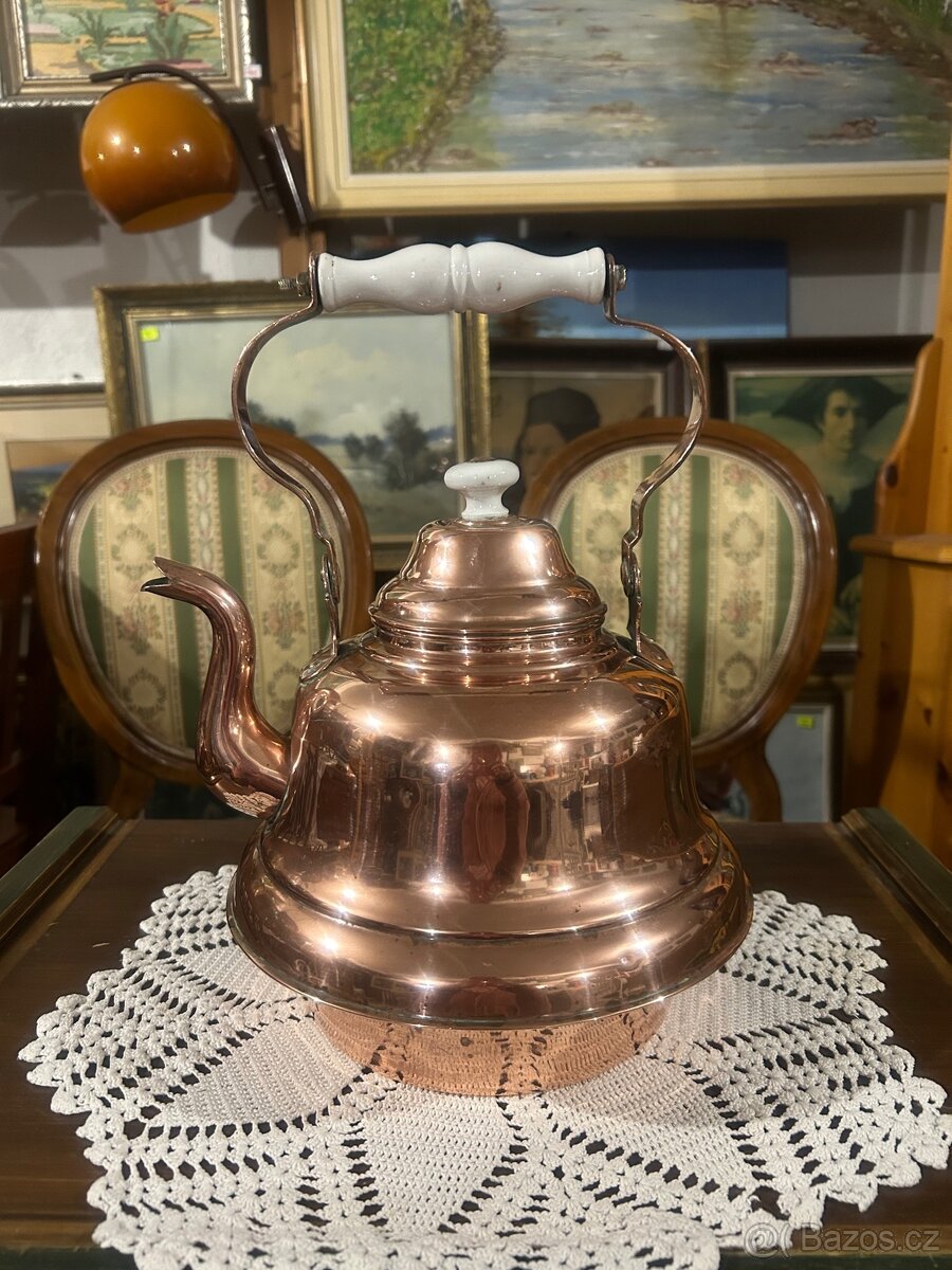 Konvice měděná masivní starožitnost - [4.2. 2026]Konvice měděná masivní starožitnost je v původním nálezovém stavu. Poměrně velká (výška 35, největší Ø je 21 cm a váží 2 kg) s nádhernou medailovou patinou má velmi vysoké krásně gravírované ucho a uživatel může využít zvýšeného těžiště ke snadnějším ...