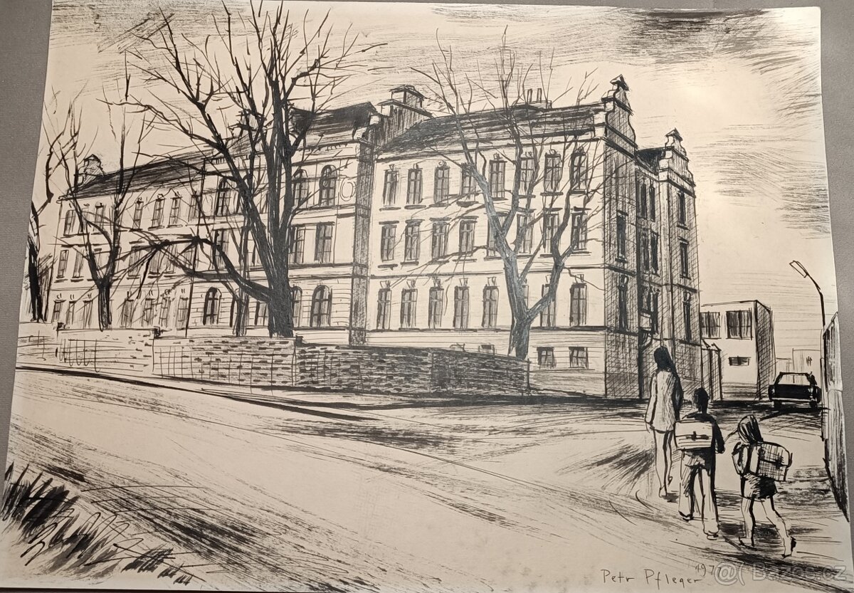Kresba tuší od Petra Pflegera rozměr 44,5x33 cm. Škola v Protivíně rok 1977. Možné předat na trase Písek Protivín Vodňany České Budějovice nebo zasilkovna.