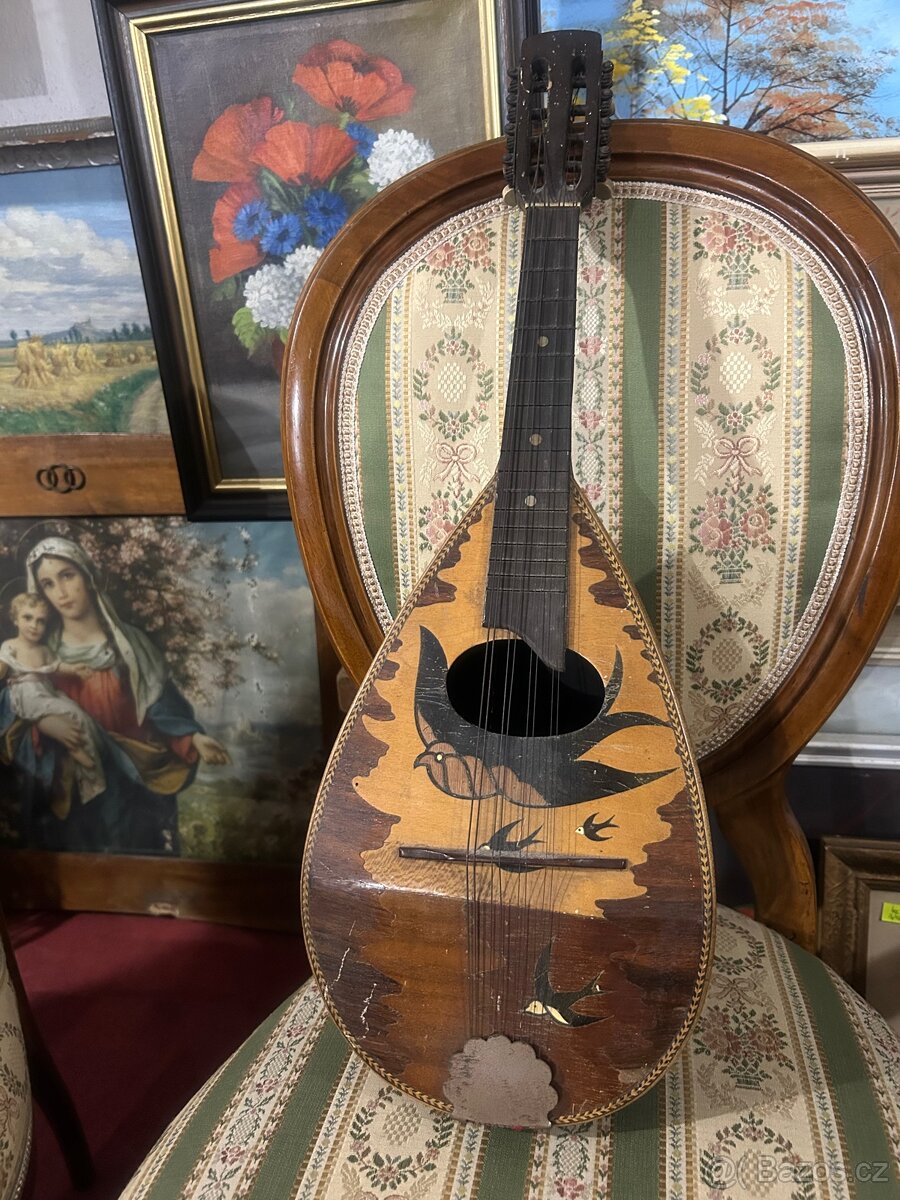 Přední deska zdobená intarzií s motivem ptáčků působí romanticky a výjimečně. Tělo má klasický mandlový tvar zadní strana z dýhovaných pruhů ukazuje stopy času krásné patinované stáří.
