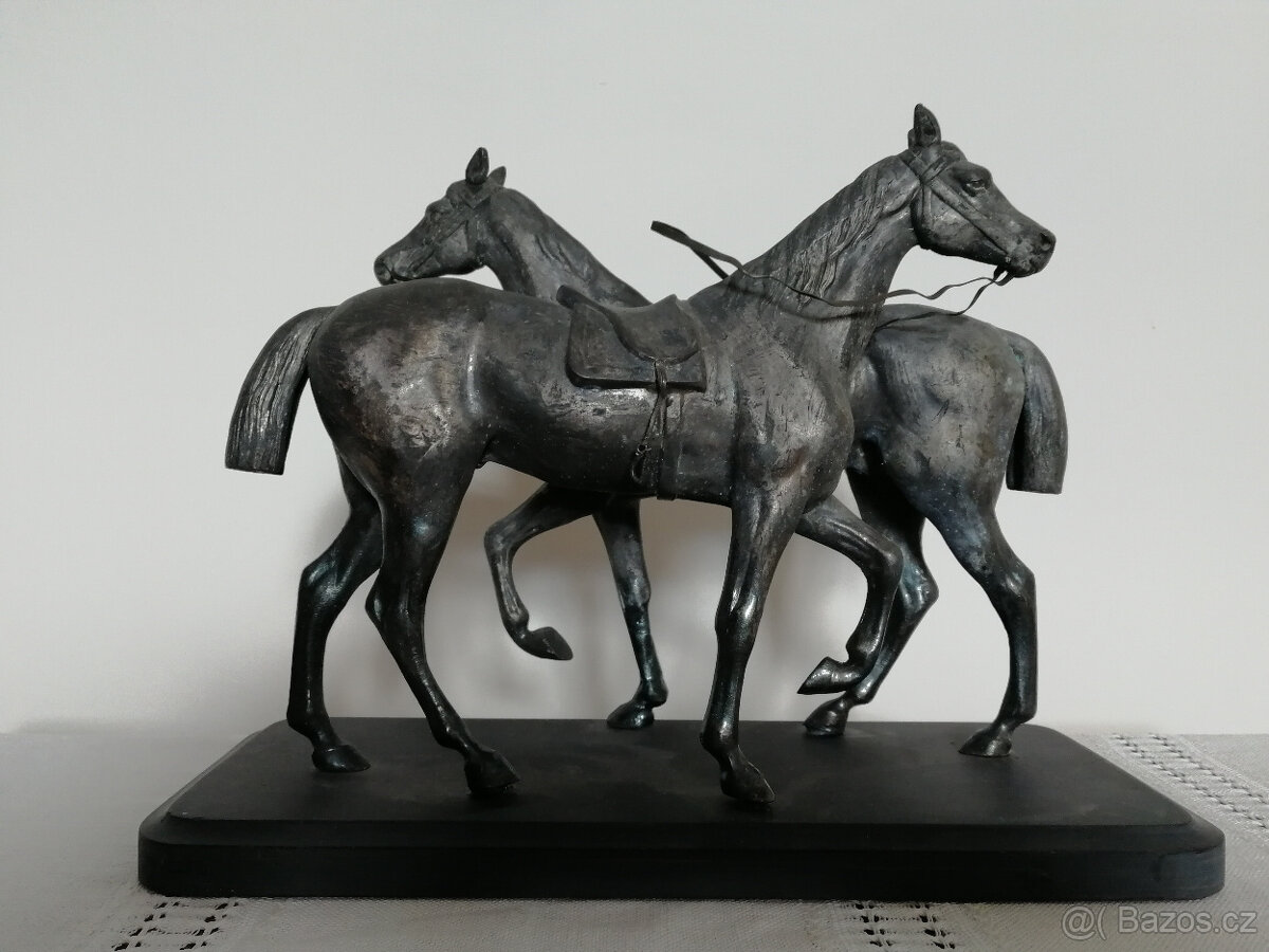 Prodám nádhernou starožitnou kovovou sošku dvou jezdeckých koní na podstavci. Rozměry ( š,h,v ) 34x14x16 cm, váha 4 kg