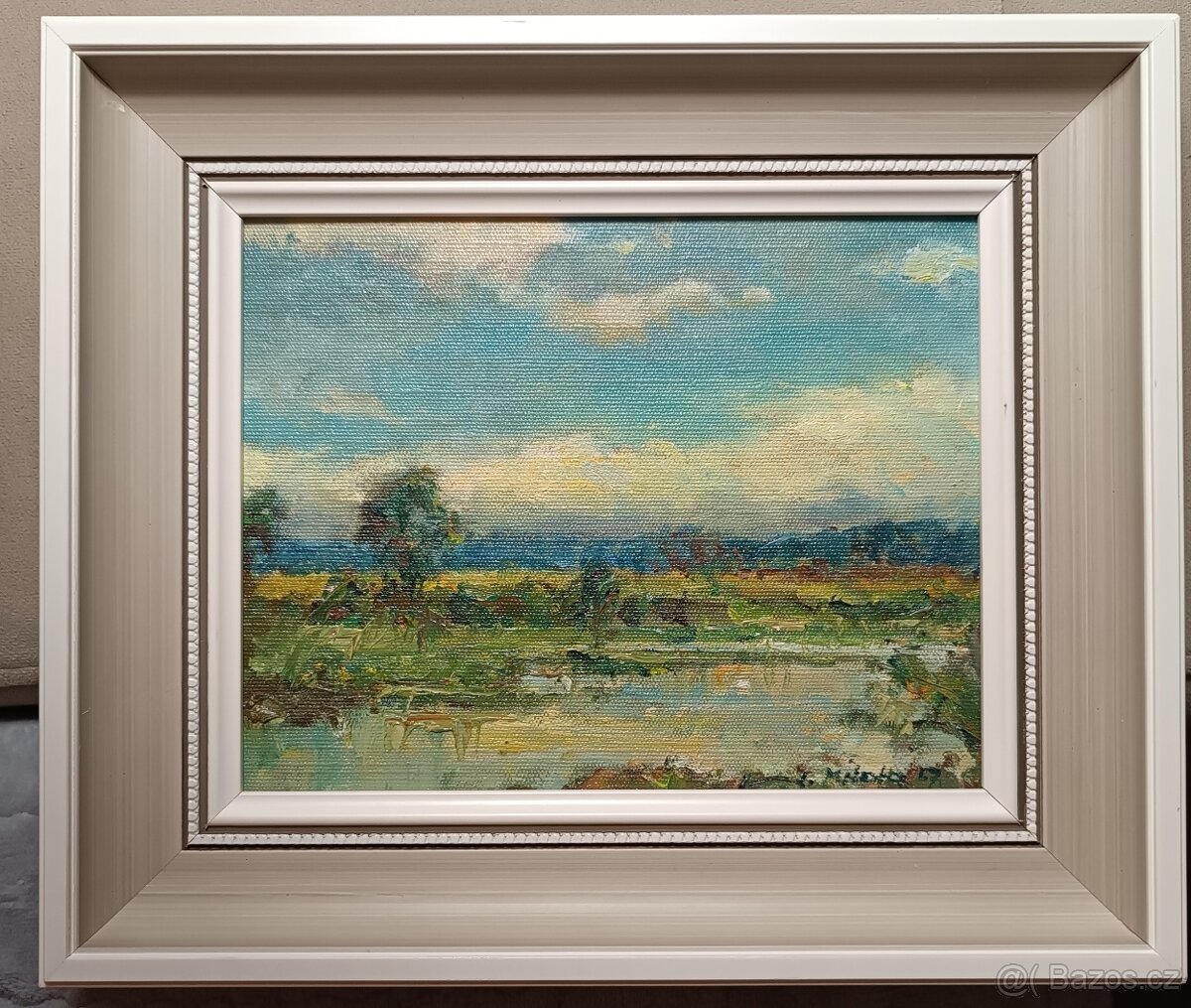Nabízím velký obraz Cestička k horám autora neznám - [11.2. 2026]Nabízím velký obraz, olej na překližce, s motivem Cestička k horám. Signatura autora vpravo dole, snad Vavrečka, nevím přesně. Obraz je v silném zlaceném rámu na dvou závěsech o celkové velikosti 121x61cm, obraz 99x61cm. Nepoškozen ani obraz ani rám. ...