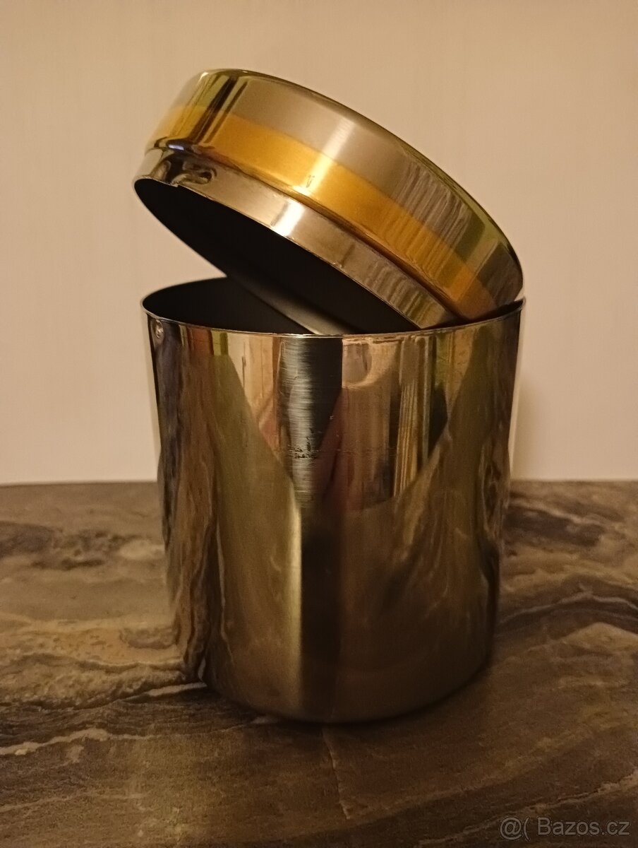 Nabízím menší dózu na suché potraviny z nerezové oceli,s pozlaceným okrajem, výška 11cm,průměr 9cm.málo používaná,púvodní cena 1600Kč, nyní 1000Kč