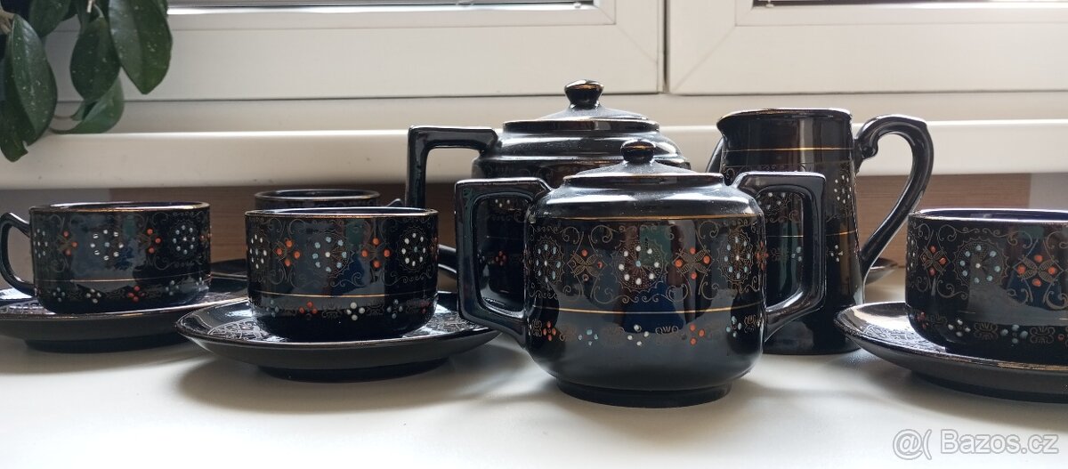 černá keramika čajová souprava, konvice na čaj, na mléko, cukřenka + 6 šálku