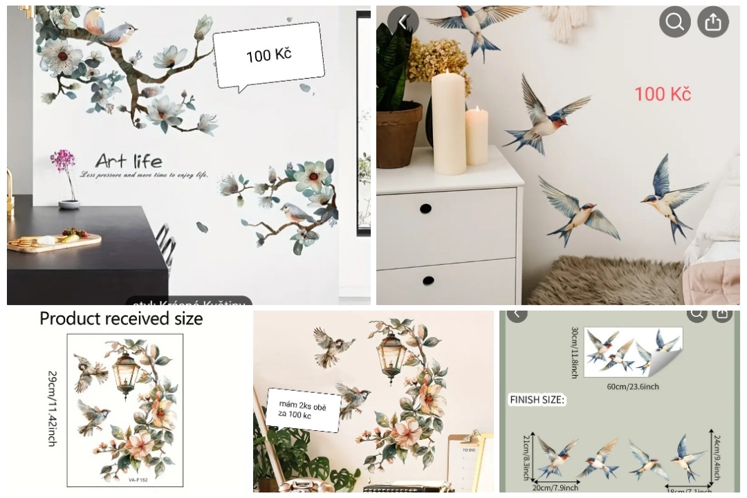 Květiny 2ks za 100 kc, strom větev 100 kc, ptáci, vlaštovka 100 kc. Samolepky nové