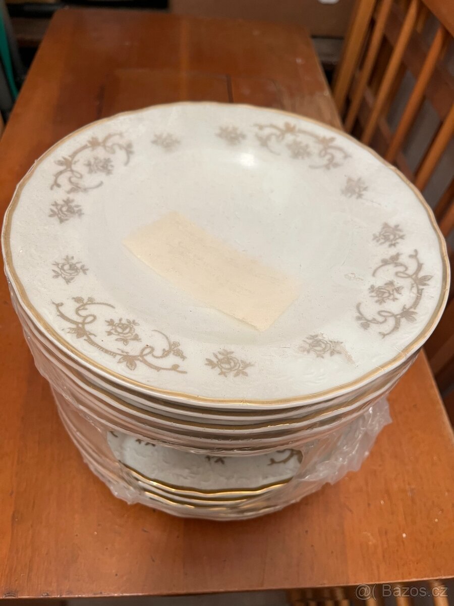 Prodám sadu talířů (6 x hluboký talíř, 6 x mělký talíř velký, 6 x mělký talíř malý) vyrobeno v Československu. Značka Bernadotte Czechoslovakia. Dekor Bernadotte - plastické reliéfní ornamenty, zlaté květinové motivy, originál balení, nové, nikdy nepoužívané.