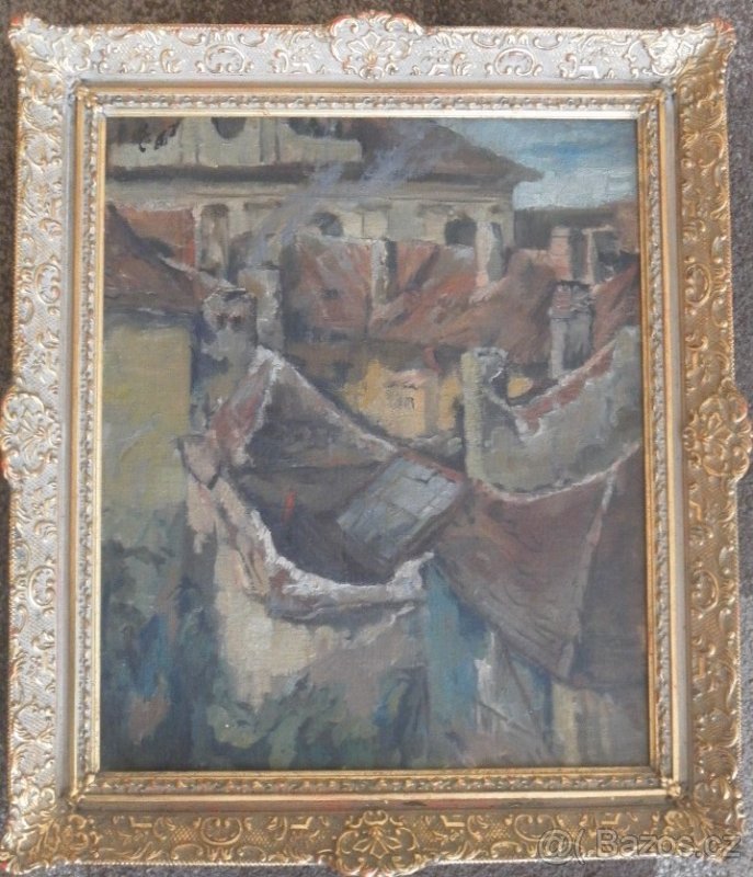 Nabízím krásný galerijní obraz od Emila Pittera - Pohled z okna na pražské střechy. Olej na hrubém plátně, podepsán E.P.vlevo nahoře. Rozměr rámu 64x74, malby 50x60cm.