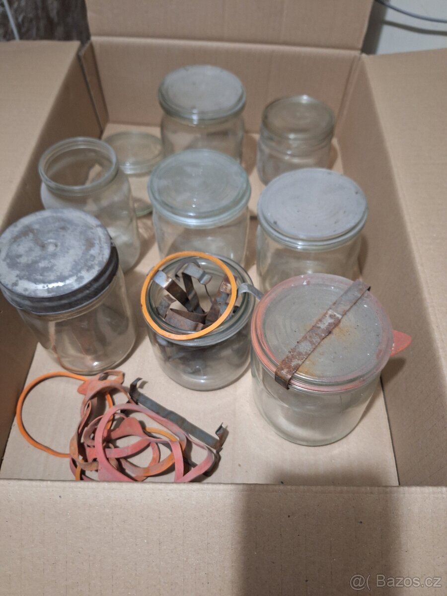 Prodám staré sklenice se skleněnými víčky, gumičkou a sponami, na konzervování, zavařování. Různé velikosti. Více kusů. Cena za malé 30,- kus, cena za větší 40,- kus.
