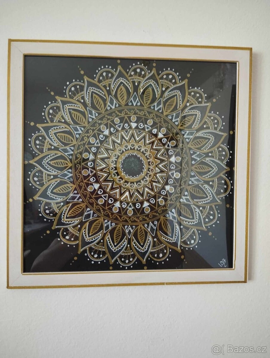 Malovaná mandala ve zlatém provedení se třpitkami po celém obvodu/ zelená /.