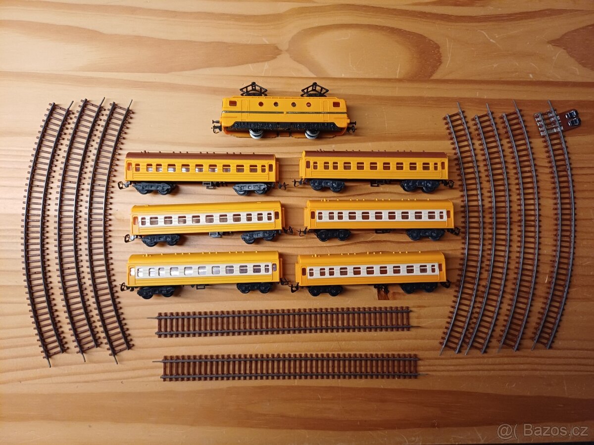 Mašinka se žlutýma a oranžovýma vagonama. A originální hnědé koleje patřící k této sadě.