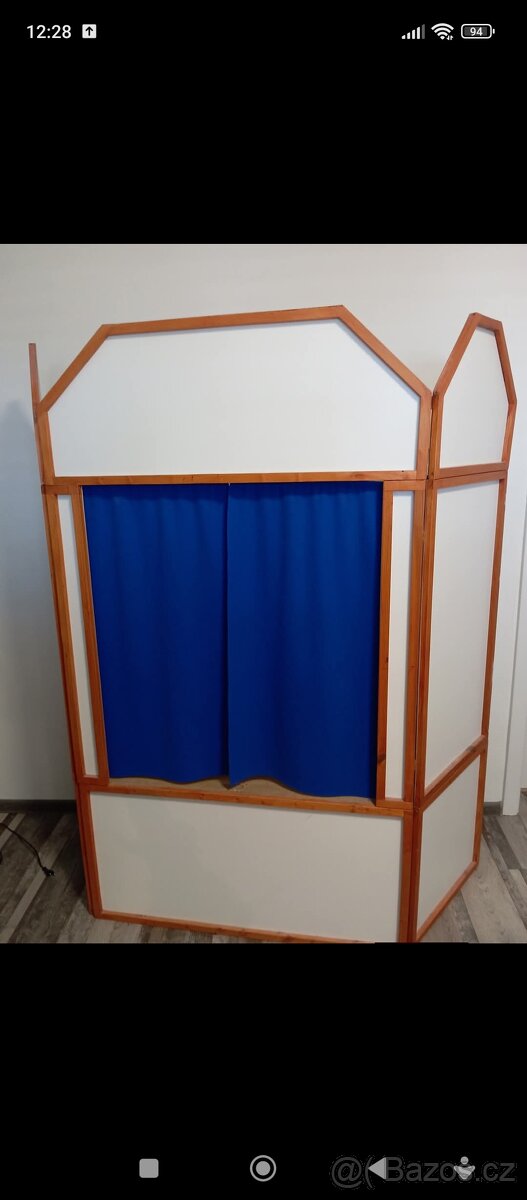 Prodám veliké ručně dělané dřevěné divadlo. Divadlo je skládací. Výška 180 cm. Šířka prostředního panelu 102cm. Šířka bočnic 50cm. Hloubka 45cm. Cena 5 500kc. Ale můžeme se domluvit. Divadlo je bílé protože se na něho může nabarvit vlastní design nebo cokoliv.
