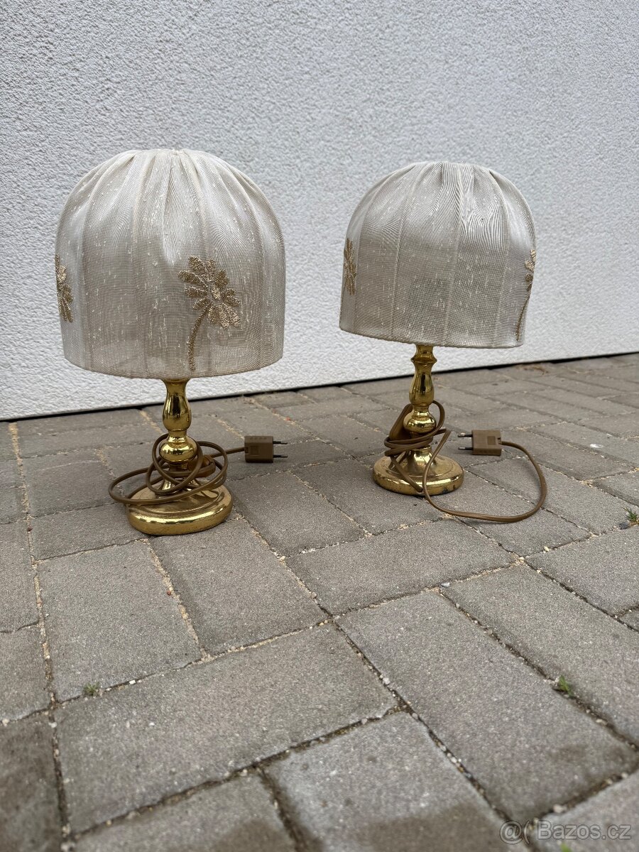 Prodám sadu dvou starožitných stolních lampiček se zlatým kovovým podstavcem a originálními textilními stínidly zdobenými výšivkou. Lampičky jsou plně funkční, původní kabeláž. Ideální jako doplněk do stylového interiéru, chalupy nebo na noční stolek.