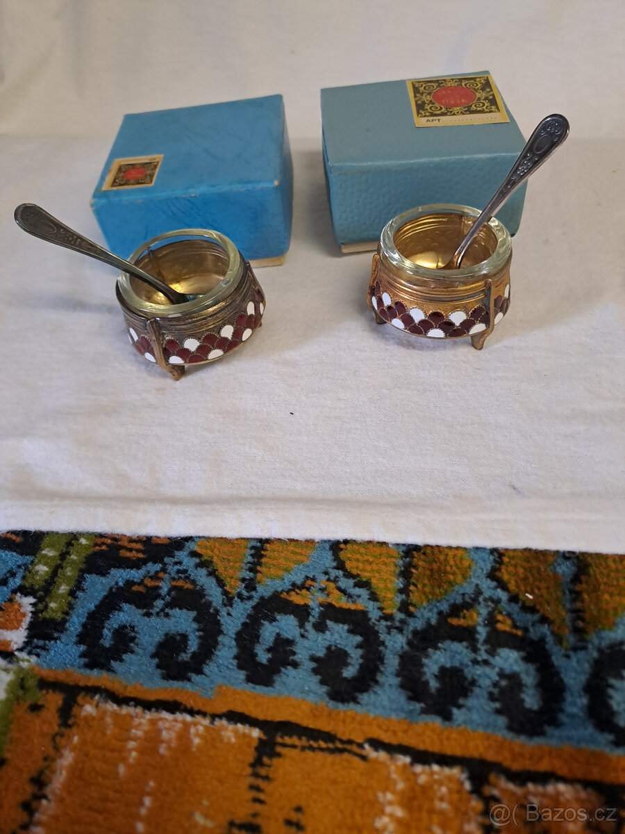 Retro kovová miska na kaviár/ solnička s lžičkou
