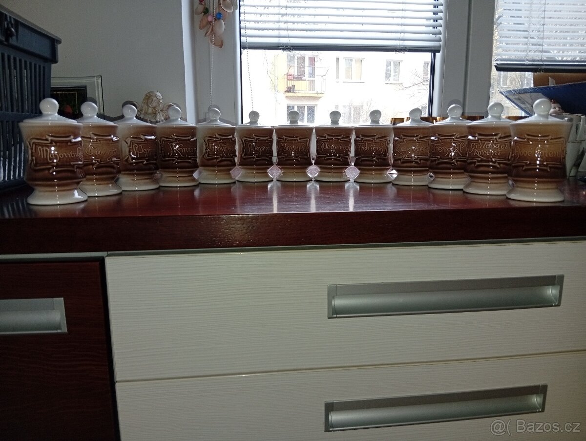 Prodám krásnou zachovalou sadu 13 kusů keramických kořenek v hnědo-béžovém retro provedení. Kořenky jsou ve skvělém stavu, bez prasklin avšak 2 z nich maji mírny oťuk, nápisy jsou krásně čitelné. Ideální doplněk do retro kuchyně nebo na chalupu.