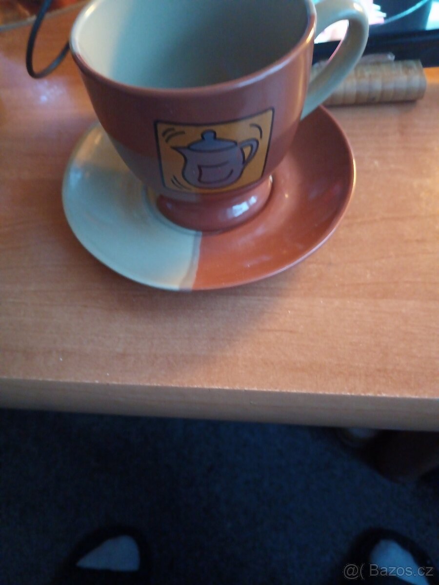 Prodám dva keramické hrnky s podsalkem značky IKEA moderní design v kombinaci hnědé a zelené barvy motiv konvičky vhodné na kávu nebo na čaj stav zachovaly materiál keramika cena 100 Kč za oba osobní předání Brno