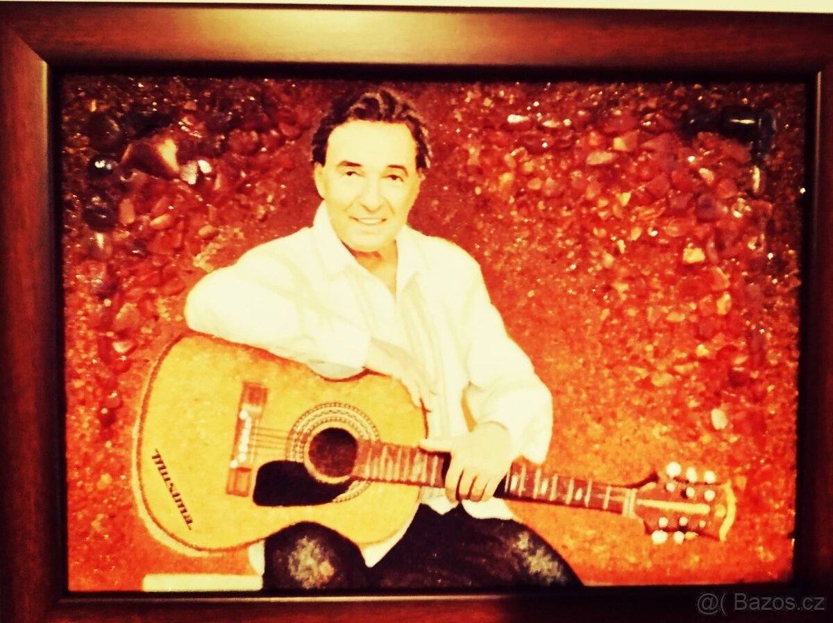 Nádherný obraz je výborný dárek, na kterém je zobrazený známý český zpěvák Karel G. vyrobený s velkým množstvím jantaru. Obraz je jen v jednom exempláři. Rozměry : 35 - 25 cm. Cena za kus 5750 Kč.