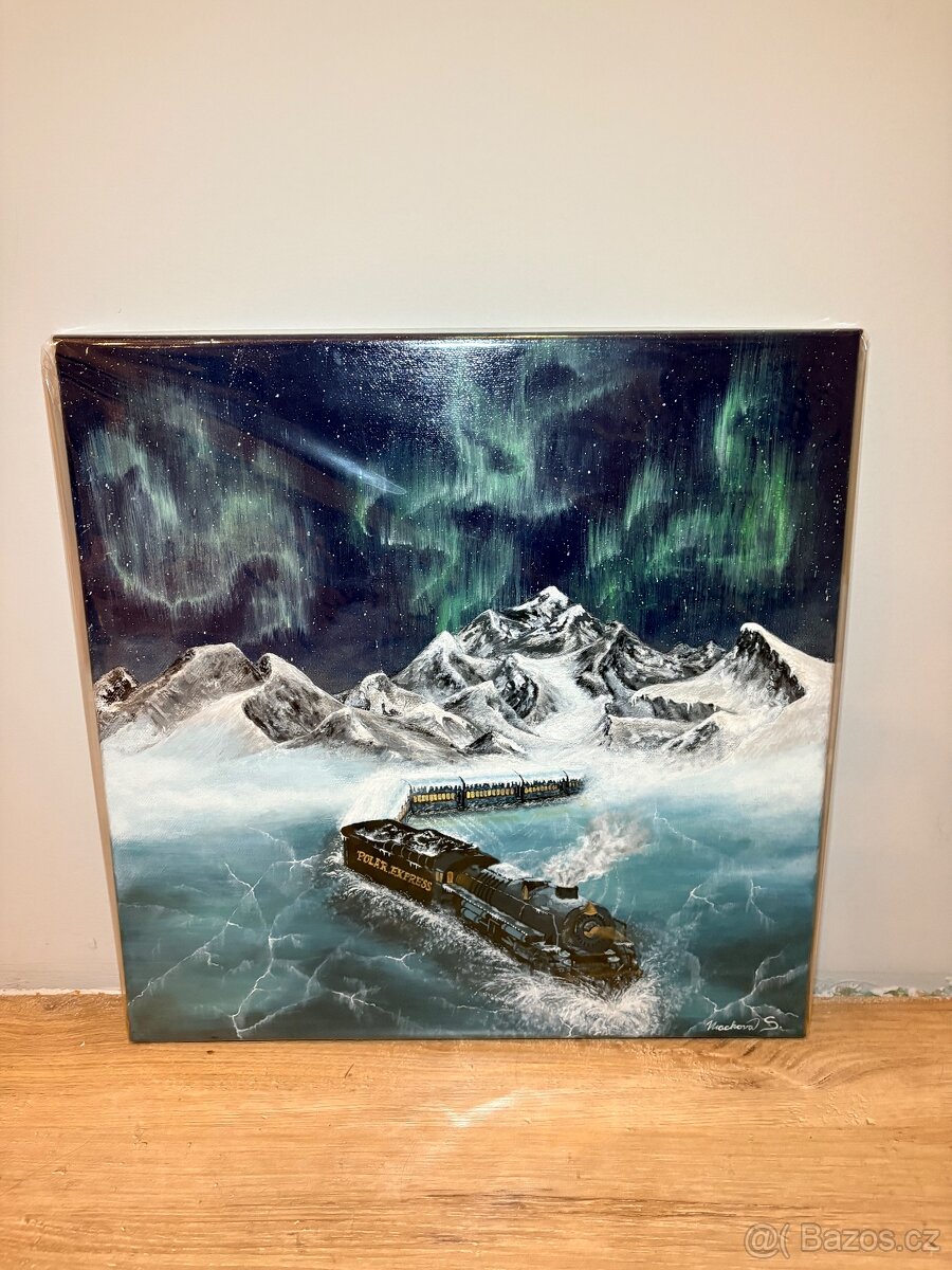 🖼️ Ručně malovaný obraz – zimní krajina s vlakem a polární září