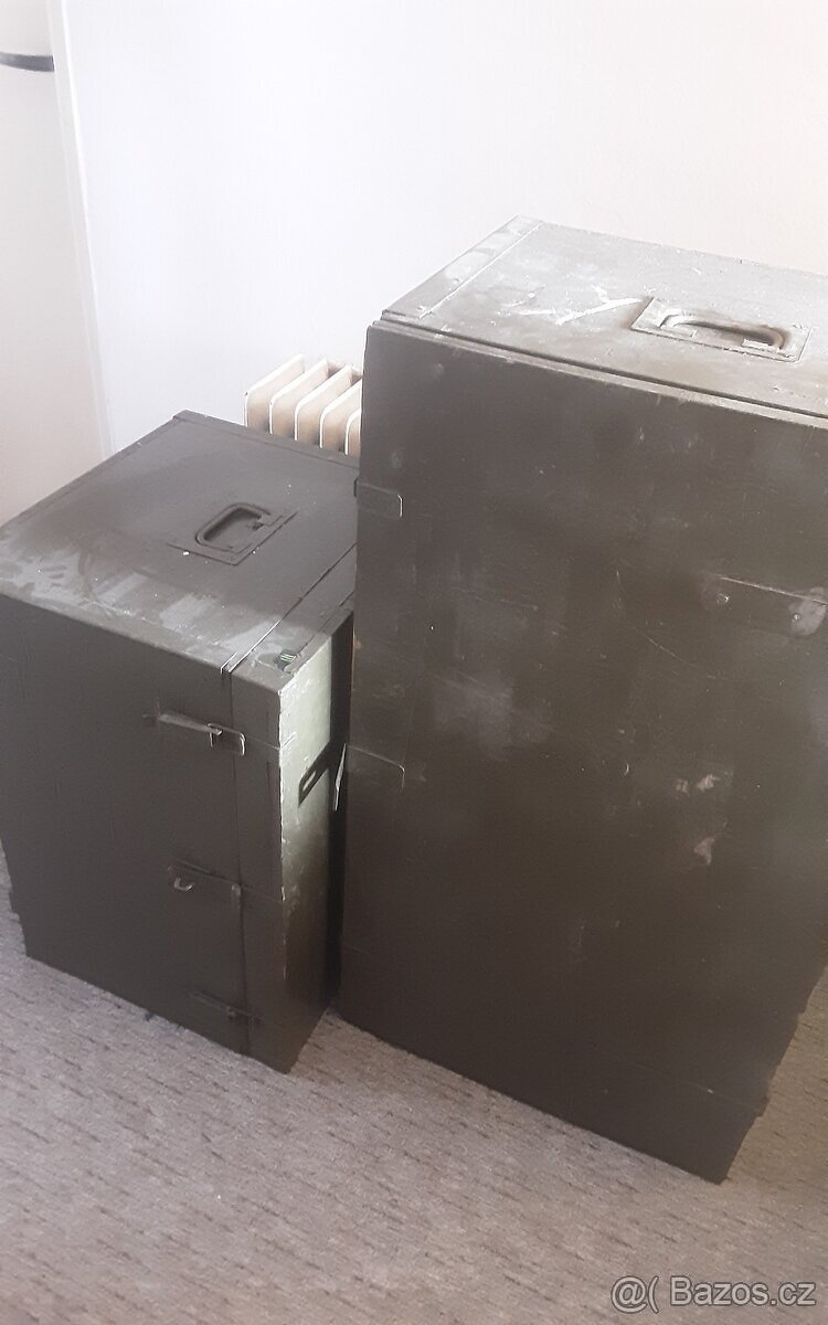 Nabízím 2 dřevěné vojenské bedny truhly.cena 500,-Kč za každou. Odběr v Kouřimi u Kolína