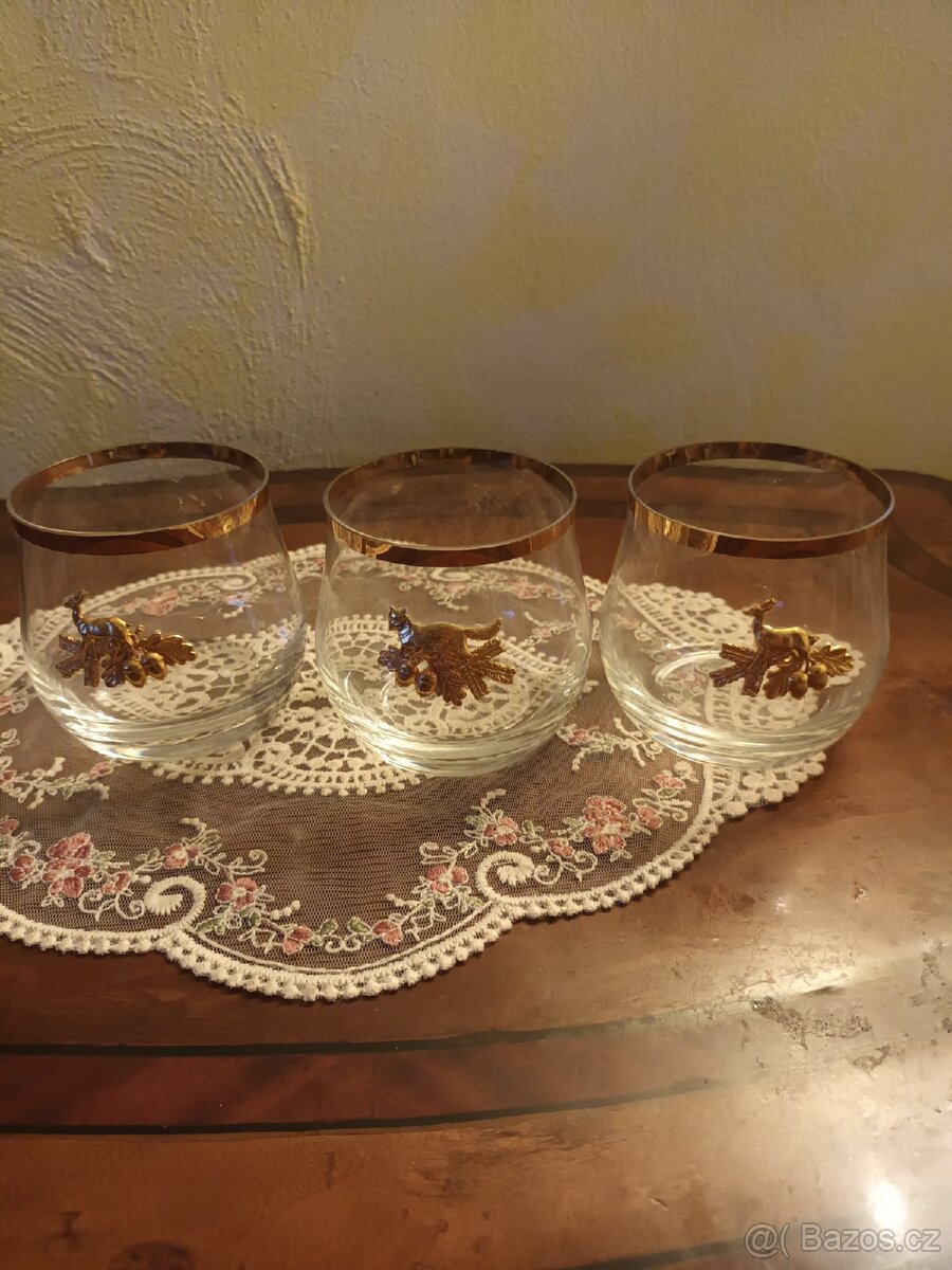 Vzhled: Sklenice jsou zdobeny zlatým okrajem a plastickými zlatými motivy lesní zvěře (např. jelen, liška) na podkladu z větviček.Použití: Mohou být využity jako dekorace nebo pro servírování nápojů.