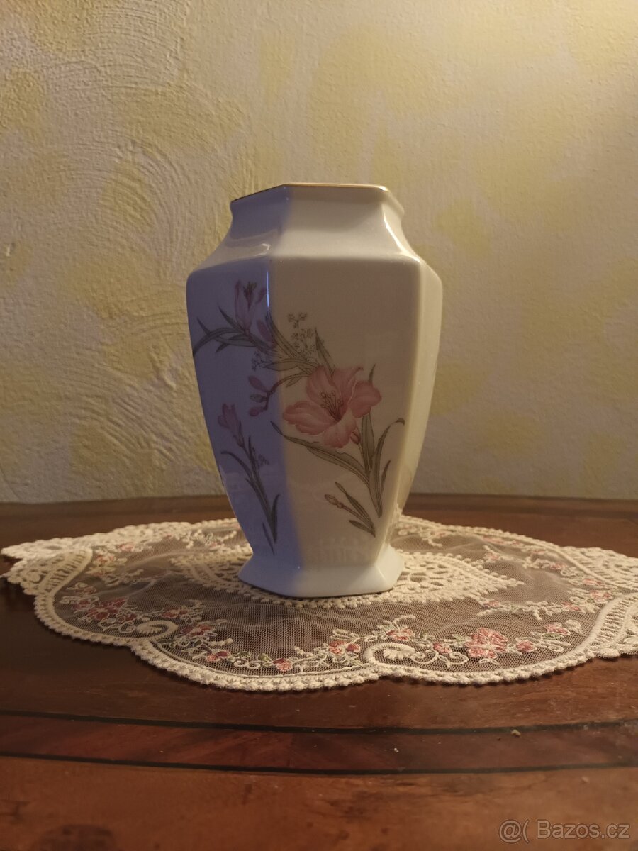 Tento předmět je starožitná porcelánová váza, která se vyznačuje elegantním hranatým tvarem a jemným květinovým motivem.