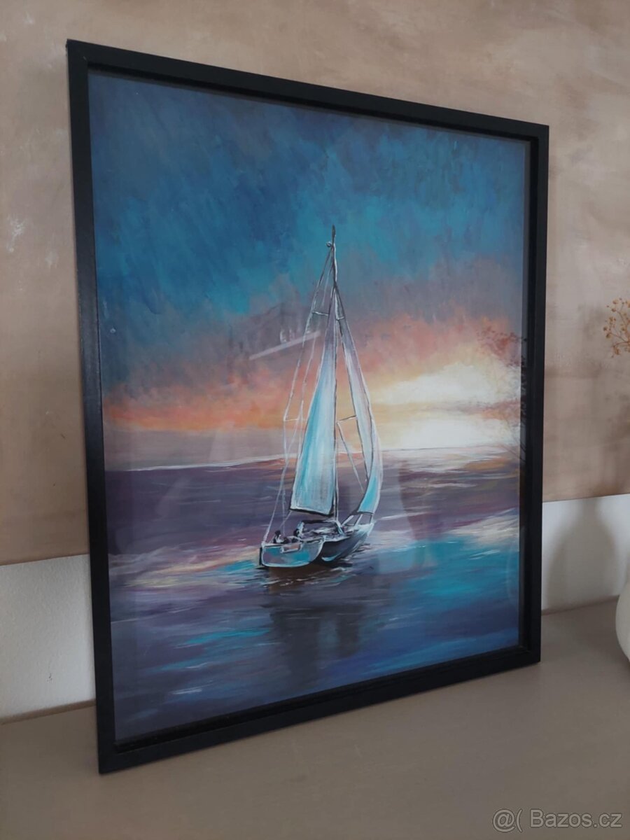 Prodávám vlastnoručně malovaný obraz Plachetnice v rámu.