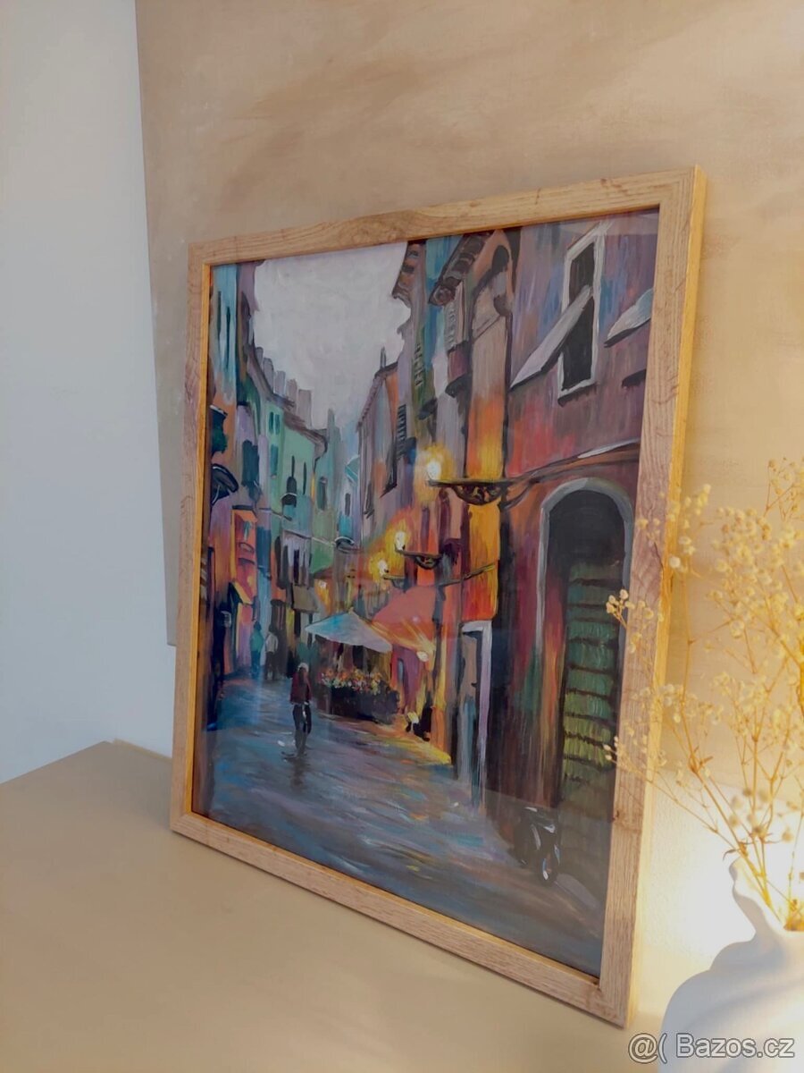 Prodávám vlastnoručně malovaný obraz Barevná ulička v rámu.