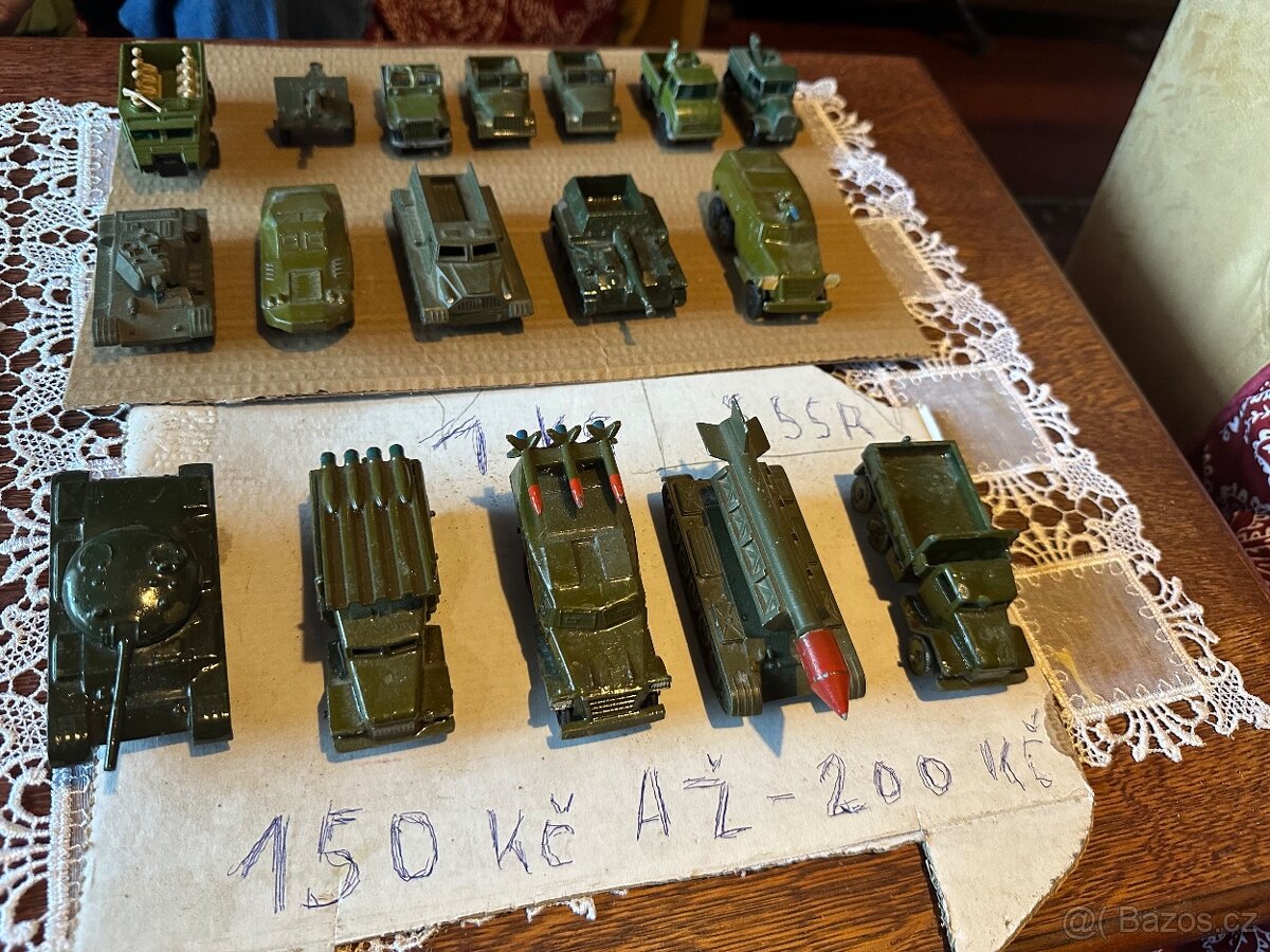 Prodám vojenské autíčka: cena první dvě řady velkých autíček 200 kč za kus.