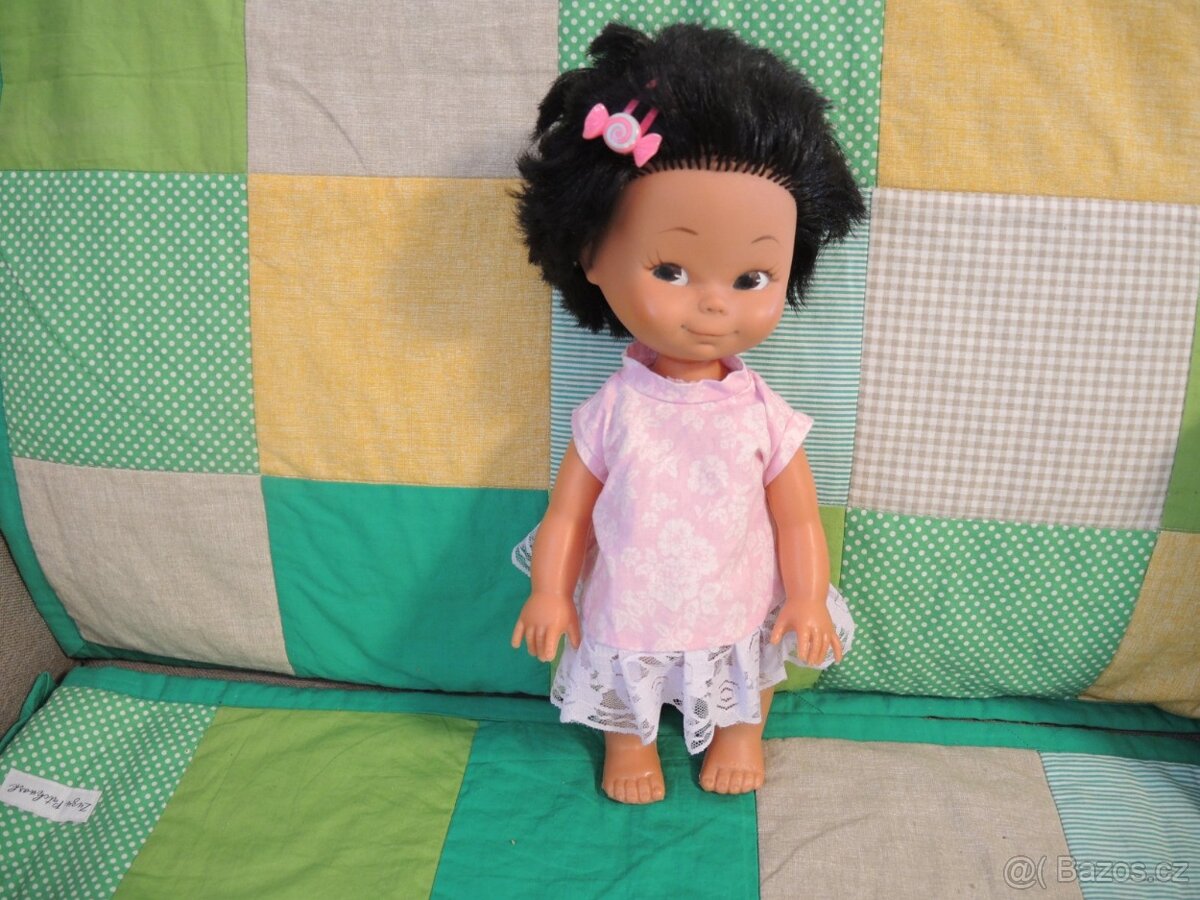 Predám krásne retro usmiate dievčatko. Je v peknom stave na svoj vek. Vlásky má pekné a šatočky ušité. Hlavičku má gumenú a telíčko celé plastové. Dá sa pekne posadiť. Hýbe rukami, nohami aj hlavou. Bábika je vysoká 35 cm.
