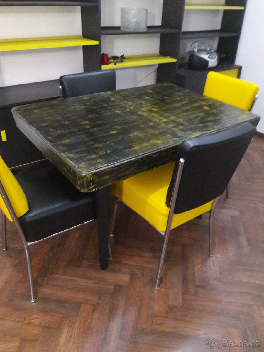 Prodám retro židle /chrom+ekokoženka/židle nově potažené,stůl renovovan ve stejném barevném provedení,je možno dokoupit skříňky rovněž stejné barvy.