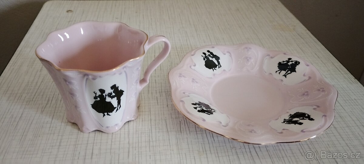 Růžový porcelán Rokoko tanečnice 7 šálků 7 podšálku 1000kč
