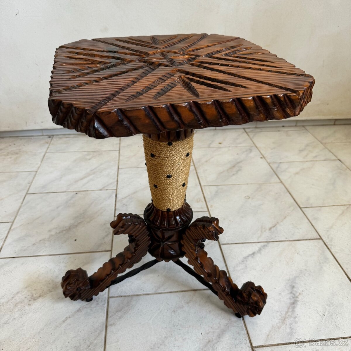 Španělský stolek zhotoven v koloniálním stylu ● bohatě zdobený ● železné kování ● masivní dřevo ● původ Holandsko ● vyroben ve třetí čtvrtině dvacátého století